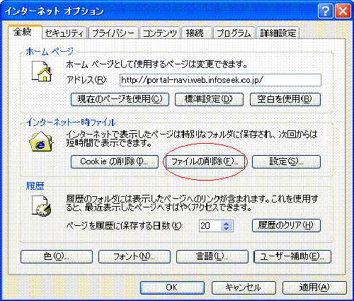 | その後、ブラウザのキャッシュ(「インターネット一時ファイル」)をクリアします。 1、ツールバーの「ツール」のインターネットオプションをクリック 2、インターネット一時ファイルの「ファイルの削除」をクリック ![]() |
